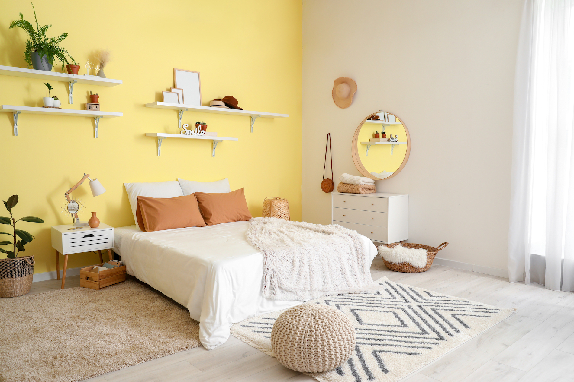 Schlafzimmereinrichtung mit weißen Regalen an gelber Wand